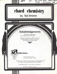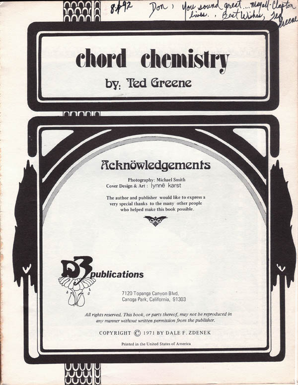This is a Chord Chemistry 2nd. edition. (Book courtesy of Don Butler.) This 2nd. edition is very rare. I have yet to find a Chord Chemistry this rare, and Ted also signed this for Don Butler. The caption reads, "Don, you sound great... Mayall/Clapton lives! Best Wishes, Ted." www.tone-man.com, www.workingclasshero.us |