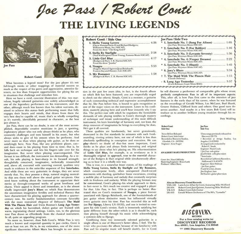 Back Cover of the Joe Pass and Robert Conti "Living Legends" LP. |