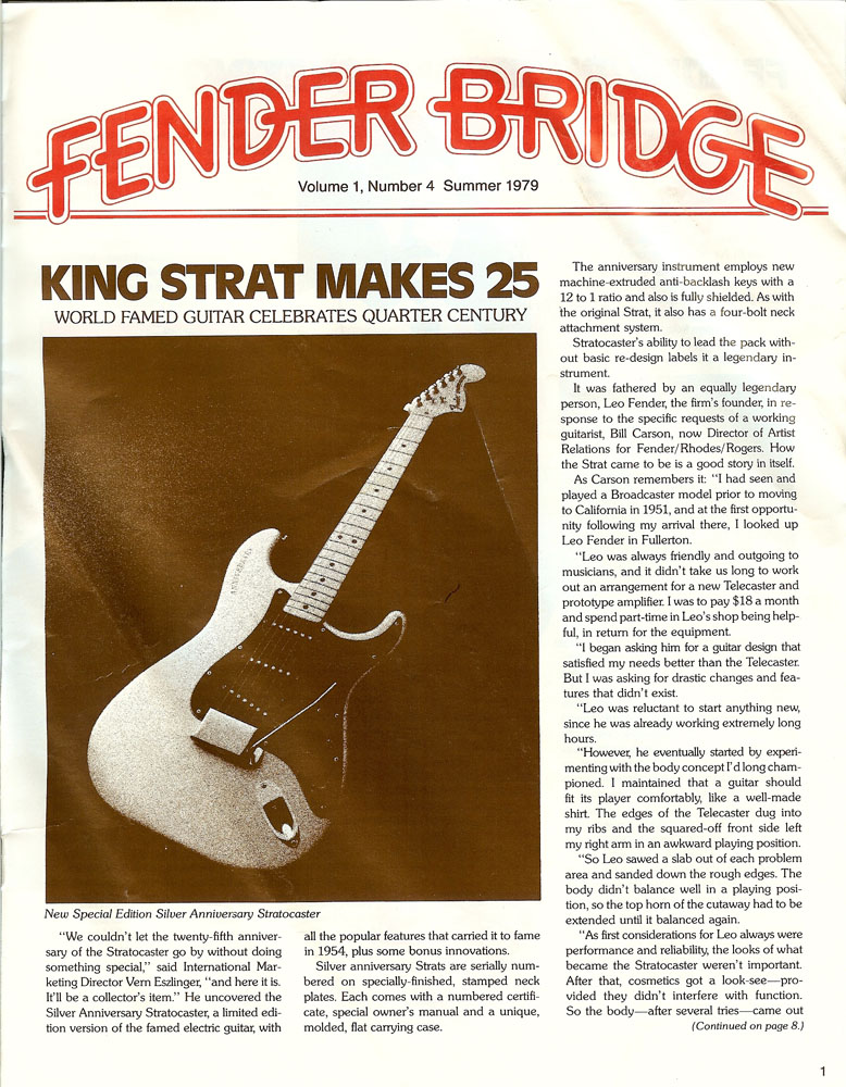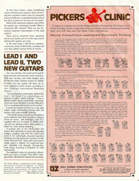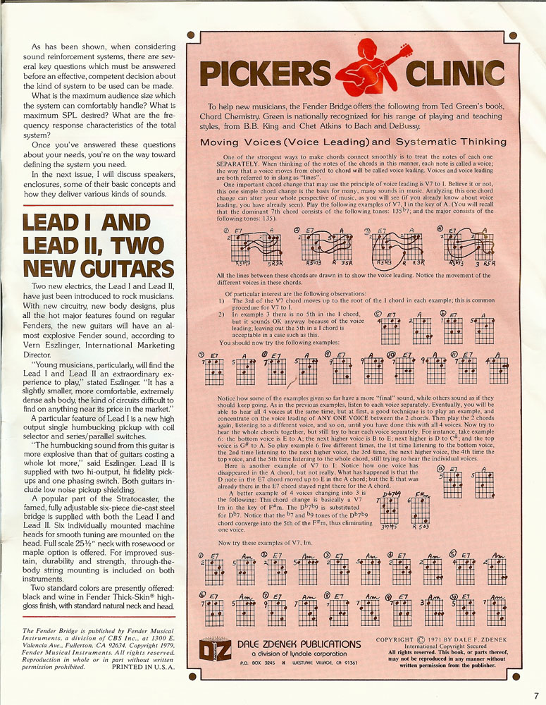 This is an 8 page information magazine published by Fender Musical Instruments. Fender would send this magazine to their retail music store customers to give away free to the consumer. Fender called me and asked if I would give them permission to use an excerpt from Ted Greene's Chord Chemistry book. Ted and I agreed that "Moving Voices (Voice Leading) and Systematic Thinking" would work well in the "Fender Bridge" magazine on the "Pickers Clinic" page. |