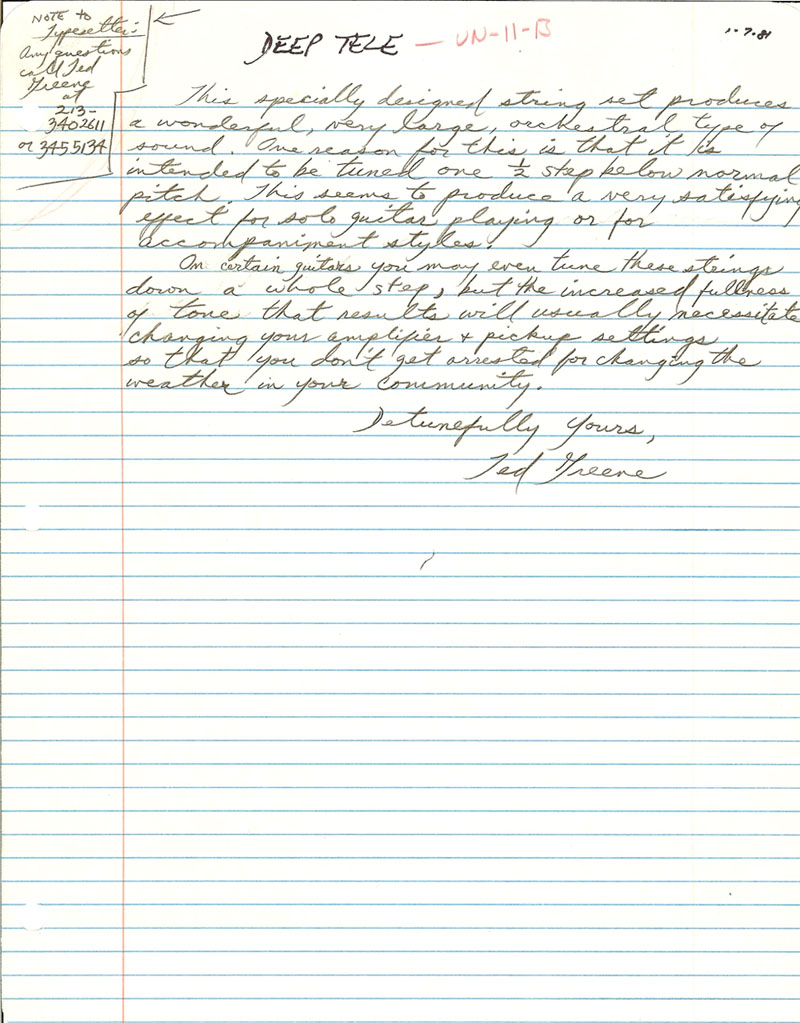 Ted Greene gave this note to me regarding what he wanted printed on the back of his "Deep Tele" Ted Greene String set. Click here for more info on Ted Greene Strings and Tommy Tedesco Strings. |