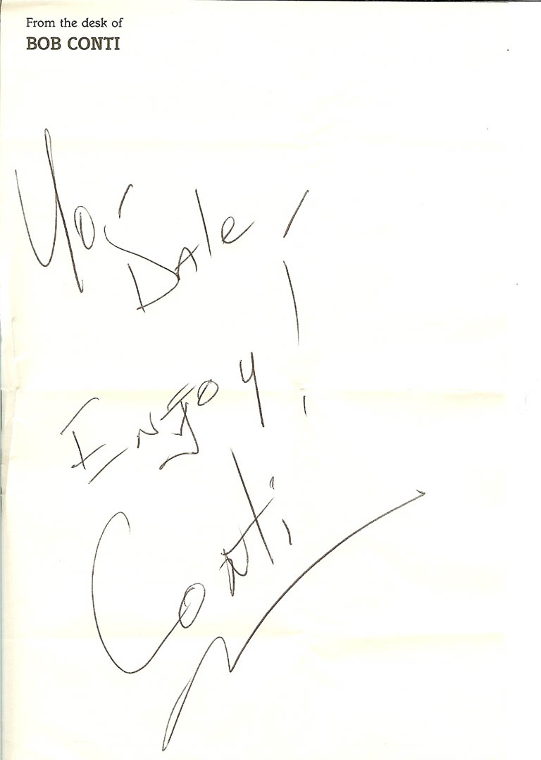 When Bob gave me a copy of his "To The Brink" CD. the above note came with it. This unbelievable Conti recording is worth buying. www.RobertConti.com |